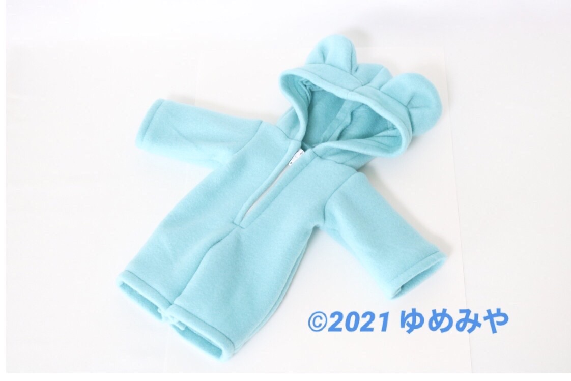 ぬいぐるみ用の、クマ耳とフードがついたオールインワンです。
